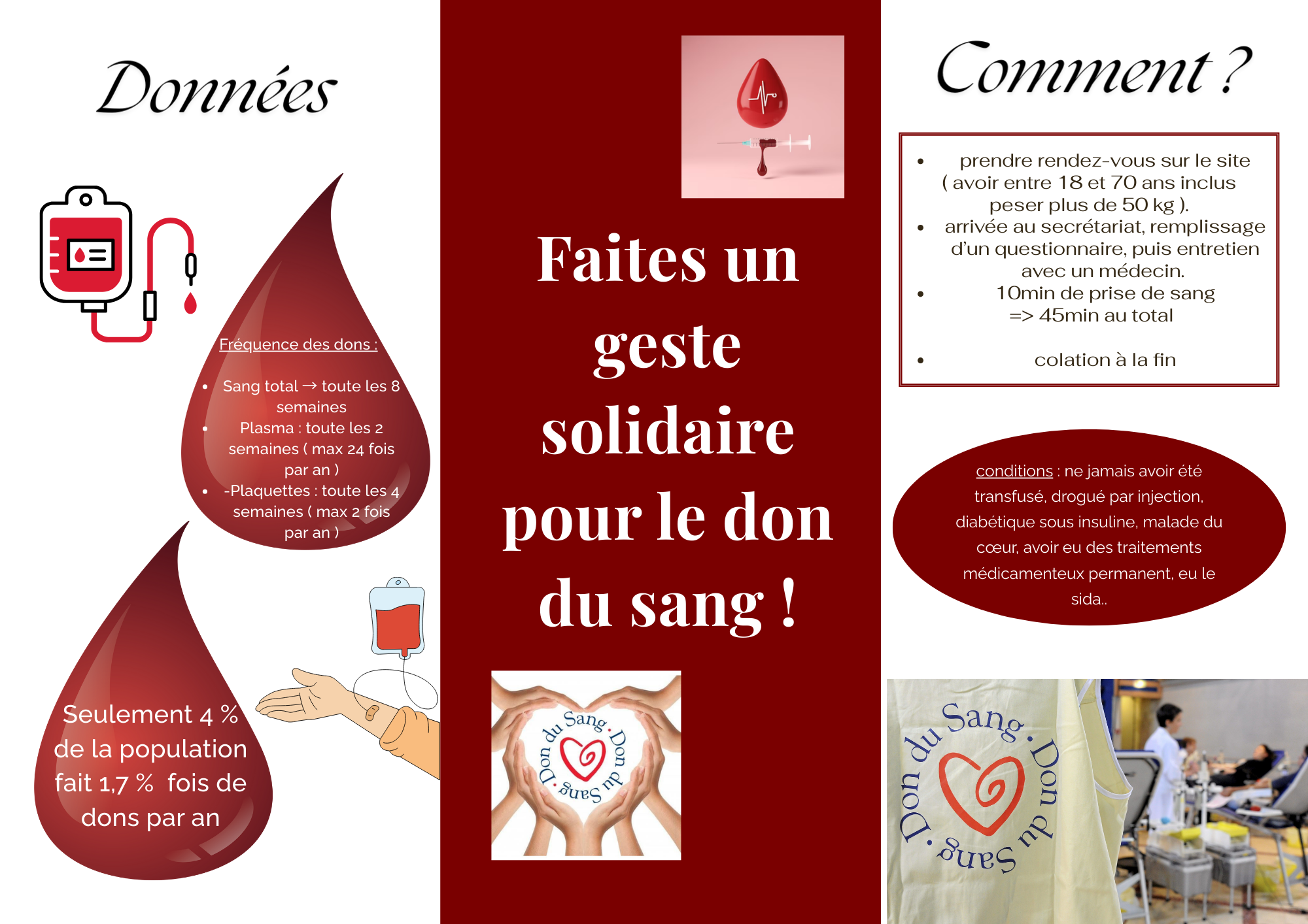 Mme Scotto et Mme Barbier, toutes deux bénévoles à l'Amicale des donneurs de sang ont expliqué aux élèves le déroulement d'un don, l'intérêt de faire ce dernier, les conditions qui doivent être remplies pour le donneur. A l'issue de cette séance, les élèves, par groupes, ont réalisé des affiches ou des flyers afin d'expliquer et de motiver leurs proches à faire un don.