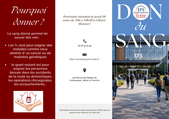 En lien avec le don du sang qui aura lieu ce jeudi 26 mars à Villard-Bonnot, les élèves de 1ère1 et 1ère6 ont eu une intervention dans le cadre du cours d'EMC sur le don du sang.